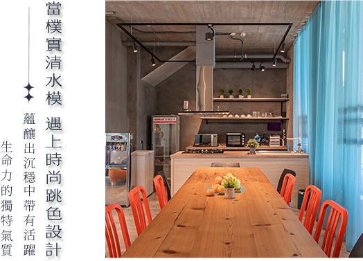 樸實內斂的室內清水模裝潢,配上點睛的豔麗設計,就像高嶺之花遇見明豔小甜餅,總能產生令人怦然心動的化學反應 ~